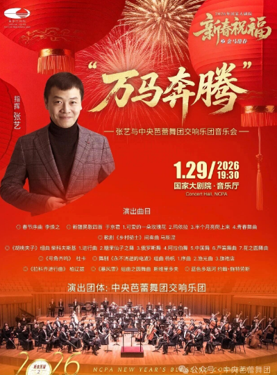 2026年1月29日,中央芭蕾舞团音乐总监、著名指挥家张艺将执棒中央芭蕾舞团交响乐团登上国家大剧院音乐厅的舞台,在国家大剧院“2026新春祝福之金马迎春”演出版块中奏响“万马奔腾”主题音乐会。本场音乐会的曲目不但融汇中外音乐佳作,还覆盖了民歌改编曲、歌剧选曲、芭蕾舞配乐选曲、电影配乐选曲等众多音乐体裁,在丙午马年即将到来之际为广大音乐爱好者送上诚意满满的新春祝福。